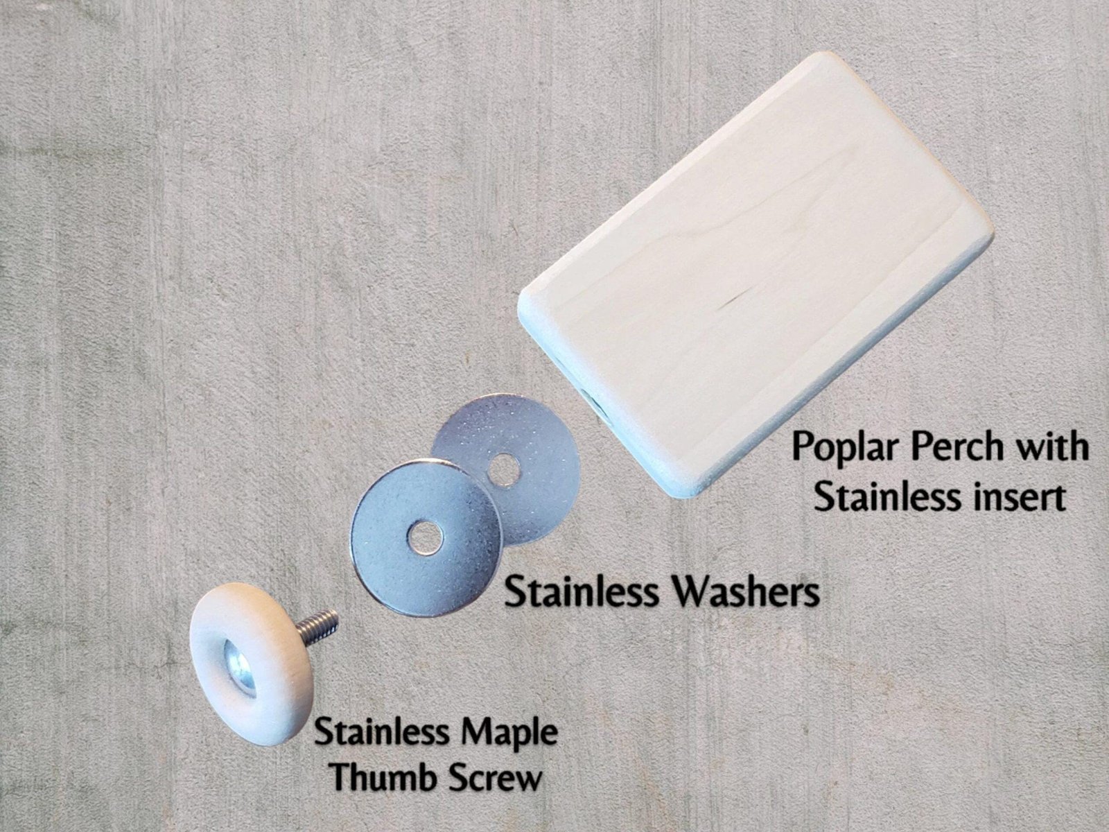• Hardwood and stainless steel thumbscrew and 1-1/2″ stainless steel washers included for safe and secure mounting to enclosure bars.